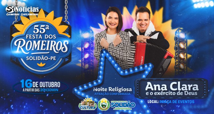 A abertura da programação social da 55ª Festa dos Romeiros de Solidão já tem atração confirmada. No dia 16 de outubro, após a missa que marca o início oficial da festa, a cantora Ana Clara & Exército de Deus sobe ao palco na Praça de Eventos, às 20h30, trazendo um grande show de fé, louvor e adoração.