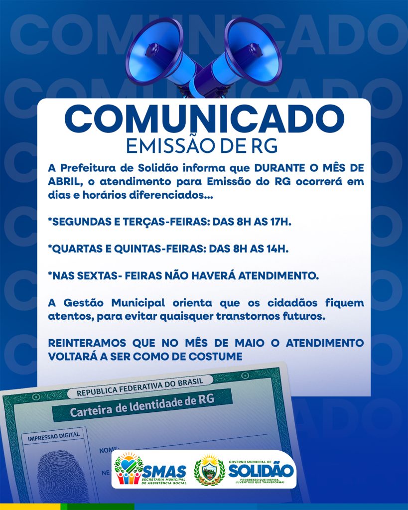 A Prefeitura de Solidão informa que, durante todo o mês de abril, o atendimento para emissão de Carteira de Identidade (RG) ocorrerá em dias e horários diferenciados, com o objetivo de melhor organizar o fluxo de atendimentos e garantir mais eficiência no serviço prestado à população.