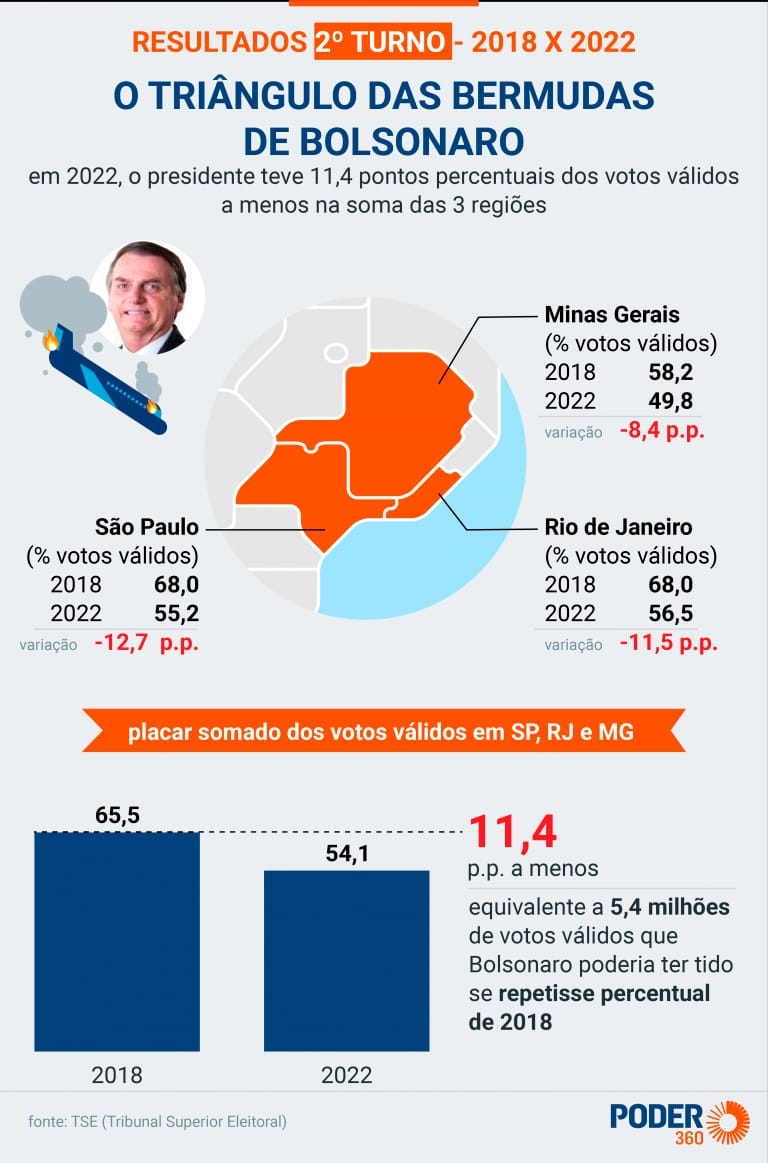 Essa expressiva diferença de 11,4 pontos percentuais em São Paulo, Rio e Minas, se aplicada ao número de votos válidos em 2022, representariam 5,4 milhões de votos a mais para o atual presidente.