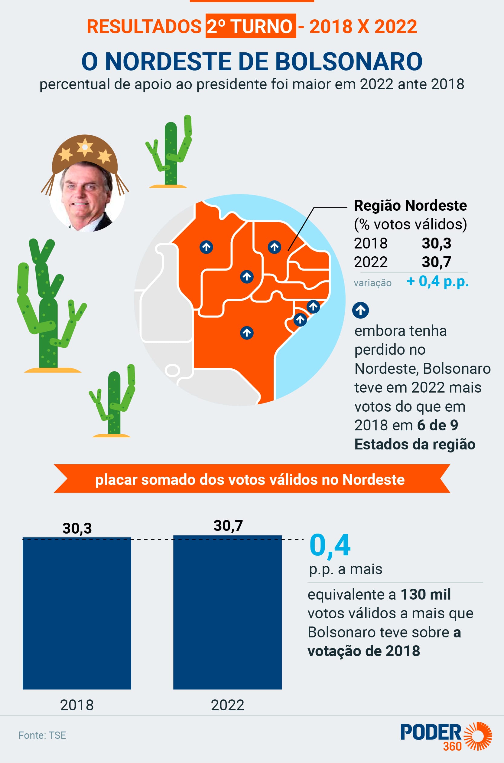 Há 4 anos, Bolsonaro recebeu 30,3% dos votos válidos dos eleitores nordestinos no 2º turno. Agora, foram 30,7%.