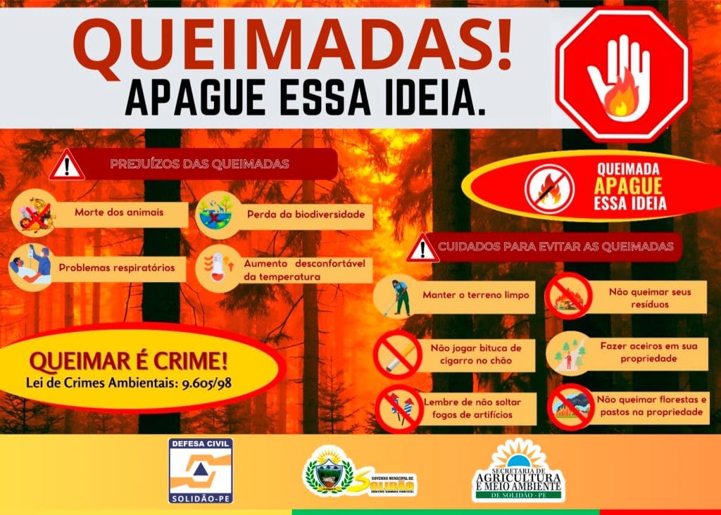 Diante desse contexto desafiador, a campanha de conscientização liderada pela Prefeitura de Solidão-PE, por meio da Coordenação Municipal de Proteção e Defesa Civil e da Secretaria Municipal de Agricultura e Meio Ambiente, visa informar a população sobre os perigos das queimadas e promover práticas sustentáveis e responsáveis. O objetivo principal é fomentar uma cultura de preservação ambiental e incentivar ações cidadãs que contribuam para a harmonia socioambiental no município. Mediante uma maior conscientização e entendimento coletivo, espera-se promover mudanças positivas e duradouras na preservação do meio ambiente em Solidão-PE e além.