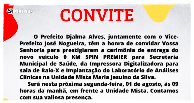 O Prefeito Djalma Alves, juntamente com o Vice-Prefeito José Nogueira, tem a honra de convidar toda a população para prestigiarem a cerimônia de entrega do novo veículo 0 KM SPIN PREMIER para Secretaria Municipal de Saúde, da Impressora Digitalizadora para sala de Raio-X e Implantação do Laboratório de Análises Clínicas na Unidade Mista Maria Jesuíno da Silva.