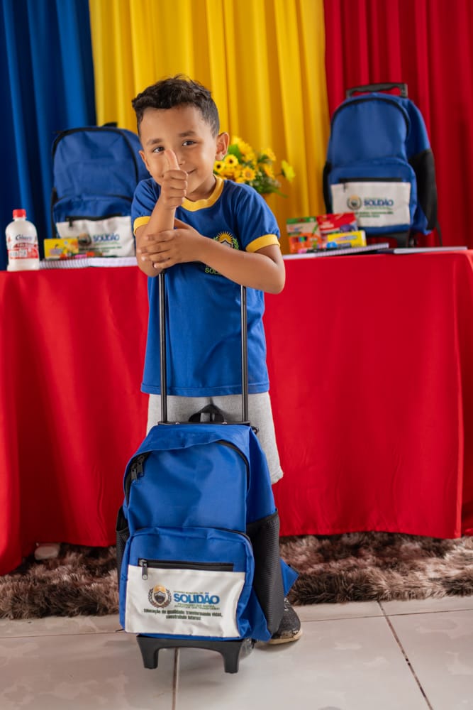 Neste ano, além dos materiais escolares, os estudantes receberam mochilas e mochilas de rodinhas, novidade que marcou a entrega e representou a realização de um sonho para muitas famílias do município.