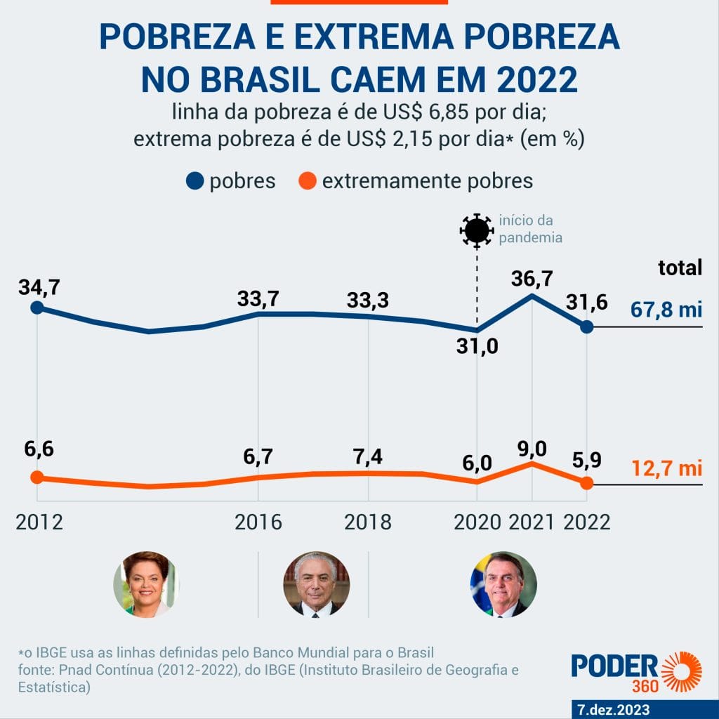 No ano passado, o Brasil teve 67,8 milhões de pessoas na pobreza e 12,7 milhões na extrema pobreza, segundo o instituto. O recuo em relação a 2021 foi de 10,2 milhões e 6,5 milhões, respectivamente. A série histórica do IBGE foi iniciada em 2012.