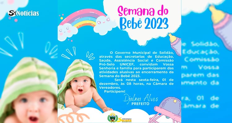 O Governo Municipal de Solidão, em parceria com as secretarias de Educação, Saúde, Assistência Social e Comissão Pró-Selo UNICEF, tem a honra de convidar toda a comunidade para a cerimônia de encerramento da Semana do Bebê 2023. O evento terá início nesta sexta-feira, 01 de dezembro, às 08 horas, na Câmara de Vereadores.