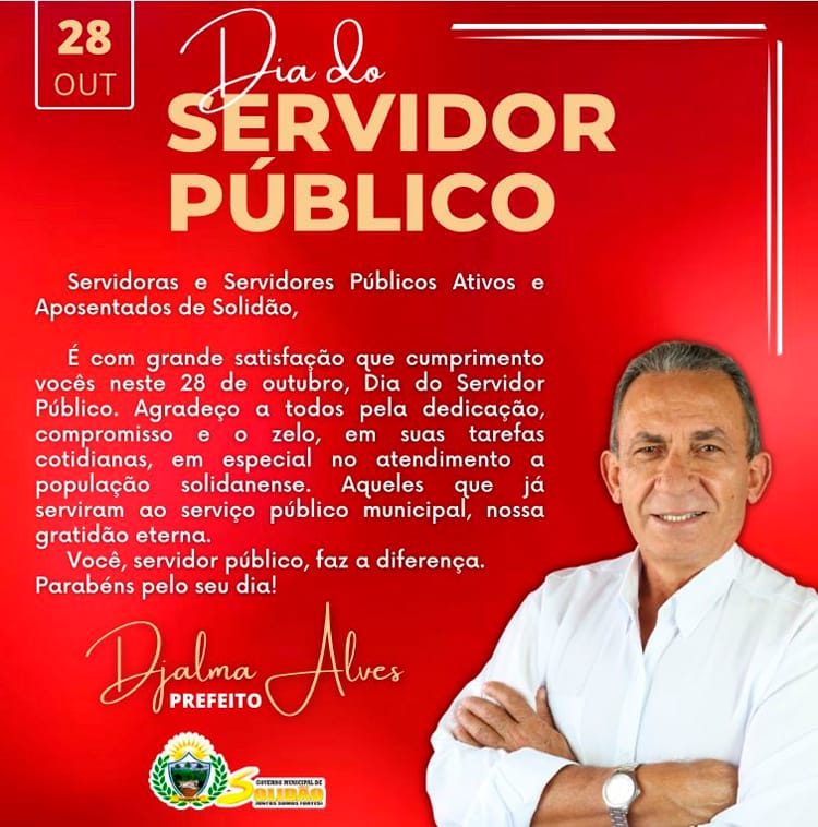 O Prefeito Djalma Alves com respeito e admiração parabeniza neste dia 28 de outubro de 2022, todos os servidores públicos de Solidão.