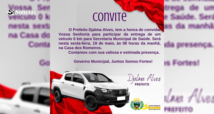 É com imensa satisfação que o Prefeito Djalma Alves tem a honra de convidar toda a população solidanense para participar da solene cerimônia de entrega de um veículo 0 km à Secretaria Municipal de Saúde. O evento será realizado nesta sexta-feira, dia 19 de maio, às 08 horas da manhã, na Casa dos Romeiros.