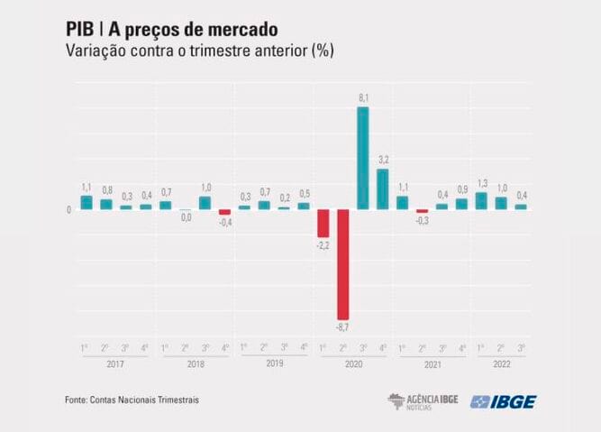 O PIB brasileiro cresceu 0,4% no 3º trimestre na comparação com o trimestre imediatamente anterior. No acumulado do ano, de janeiro até setembro, apresentou crescimento de 3,2% na comparação com o mesmo período do ano passado. As previsões do ano de 2022 devem mudar.