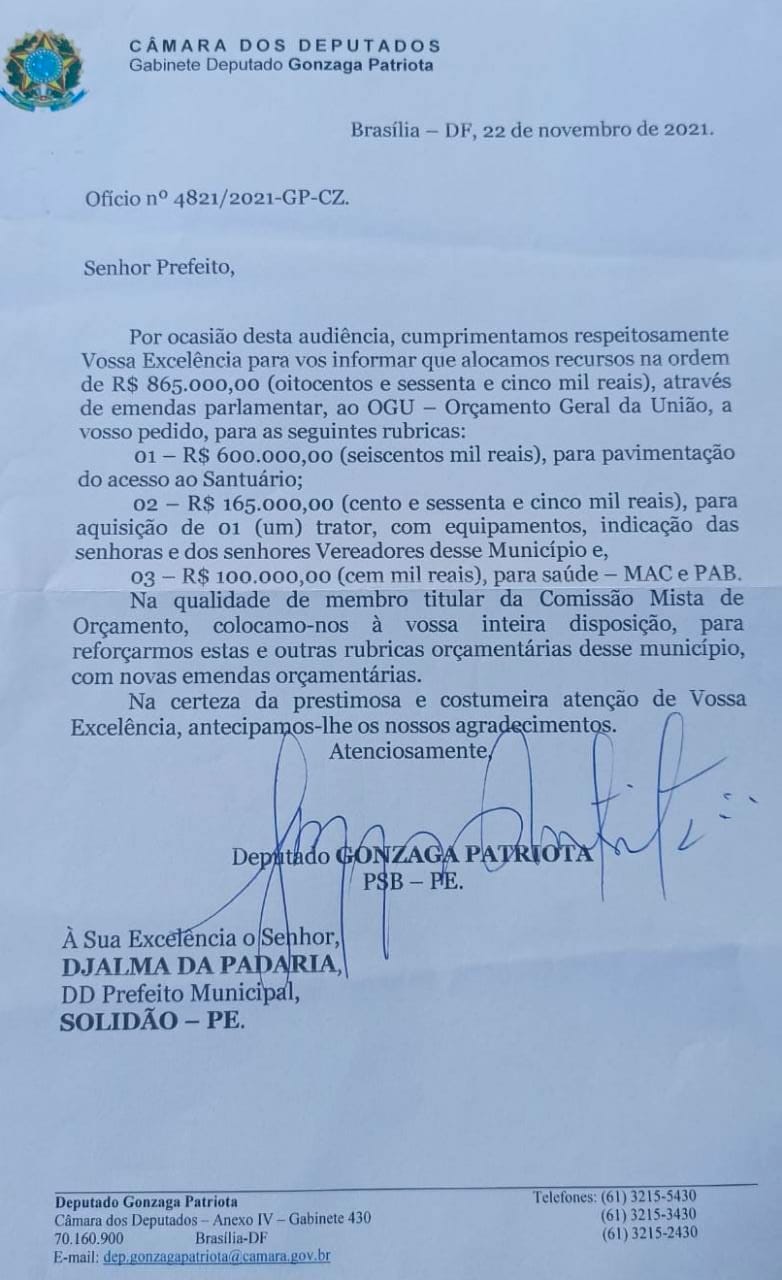 O Deputado Federal Gonzaga Patriota mais uma vez mostrou a preocupação e o carinho que tem com Solidão e destinou: