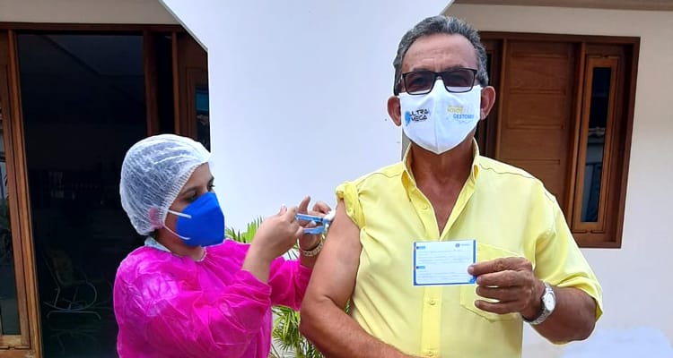 Djalma recebeu a vacina em sua residência, através das profissionais de saúde: Patrícia (Enfermeira), Linda (Agente de Saúde), Maria José (Agente de Saúde) que atua na área onde reside o prefeito, e a coordenadora do PNI, Vitória.