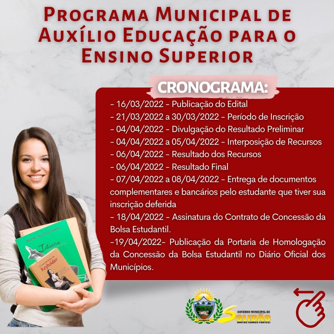 A prefeitura de Solidão vai abrir inscrições a partir da próxima segunda-feira, 21 de março, para o Programa de Crédito Educativo de Auxílio Educação – Projeto Bolsa de Estudo Rotativo.