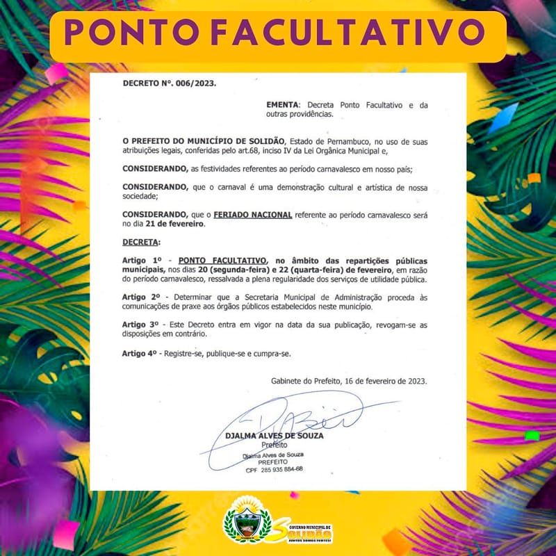 O Prefeito Djalma Alves do município de solidão, Sertão de Pernambuco, no uso de suas atribuições legais, decreta ponto facultativo no período das festividades carnavalescas. A medida, visa permitir que os servidores municipais tenham a opção de aproveitar os festejos e manter as tradições comuns à época.