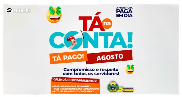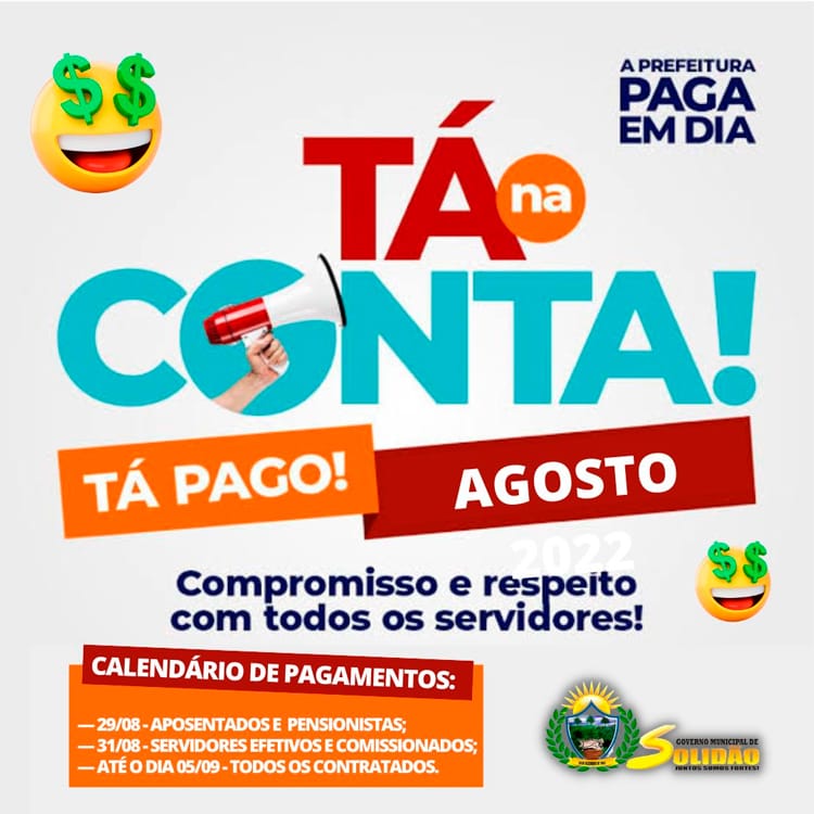 A Prefeitura Municipal de Solidão, comunica a todos os servidores públicos do município que o pagamento referente à folha do mês de agosto começa a ser pago nesta quarta-feira (31 de agosto de 2022).