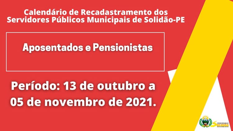 A Prefeitura de Solidão, Sertão de Pernambuco comunica que iniciou nesta quarta-feira (13 de outubro de 2021), o recadastramento dos servidores municipais, no período de 13 de outubro a 08 de novembro está sendo realizado o recadastramento de todos os funcionários efetivos ativos e inativos do município.