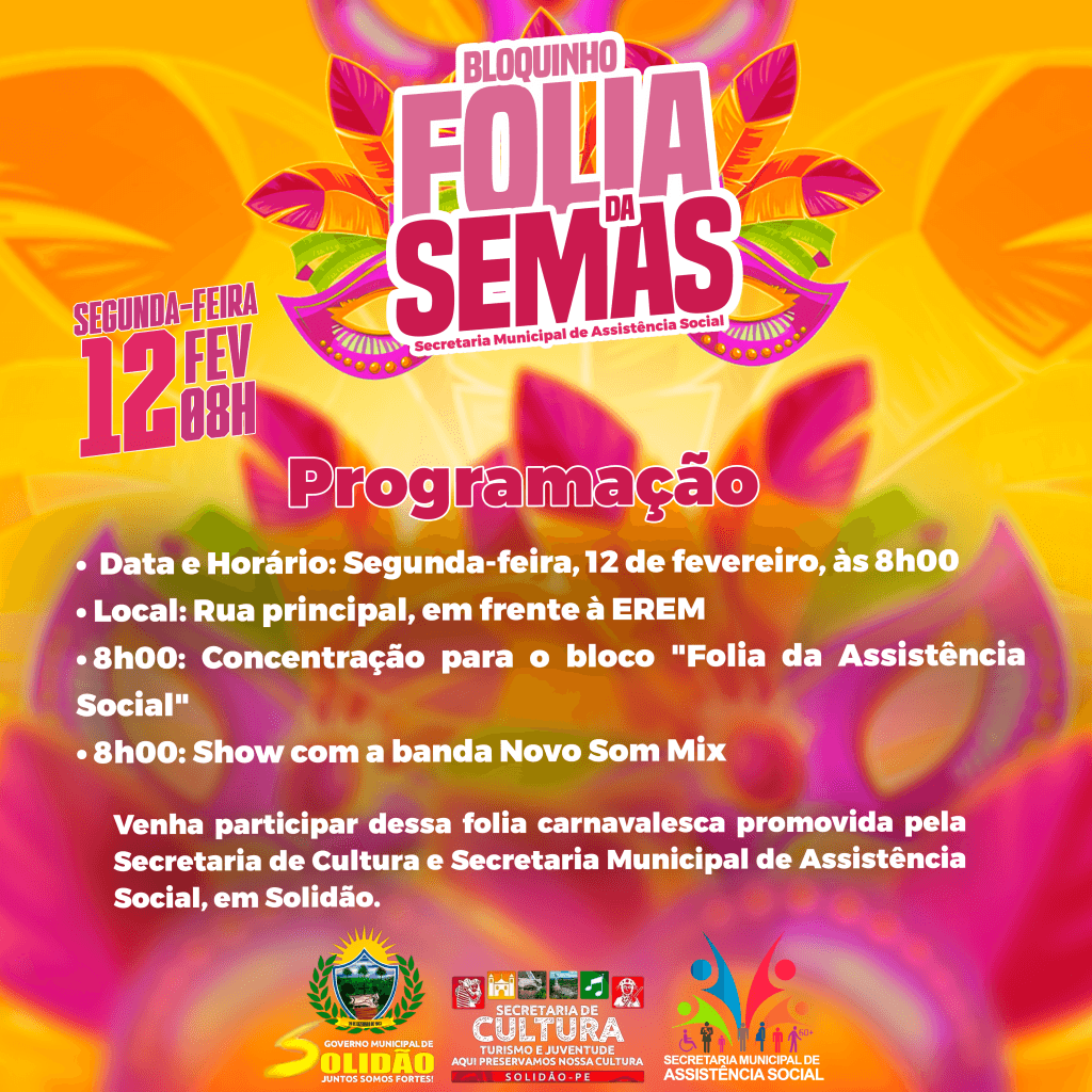 Seguindo a diretriz do prefeito Djalma Alves de fortalecer os laços familiares e comunitários, a Secretaria Municipal de Assistência Social de Solidão organizará, nesta segunda-feira (12), a partir das 08:00 horas, um animado bloco carnavalesco. O evento tem como público-alvo gestantes, crianças, adolescentes e idosos.
