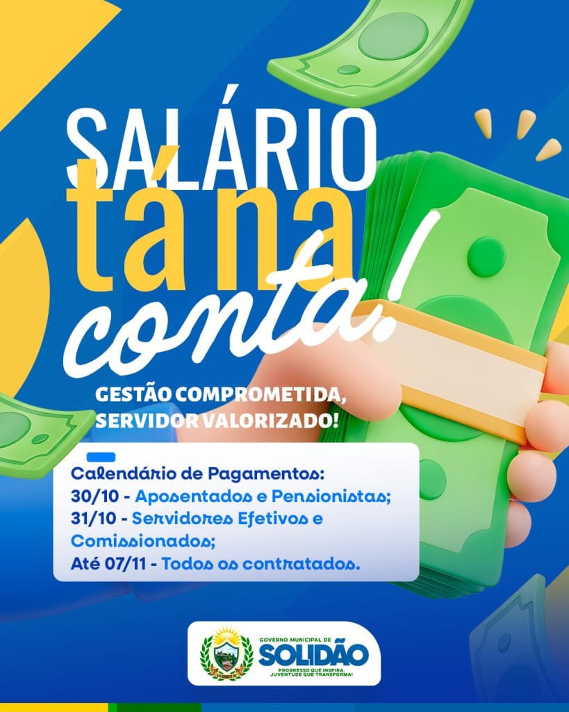 A Prefeitura de Solidão, anunciou o pagamento referente ao mês de outubro para todos os servidores municipais. De acordo com o calendário, aposentados e pensionistas receberam no dia 30 de outubro, enquanto os servidores efetivos e comissionados tiveram o pagamento creditado nesta sexta-feira, 31 de outubro. Já os contratados recebem até o dia 7 de novembro.