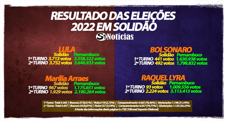 Segundo os dados do Tribunal Superior Eleitoral (TSE), em Solidão Sertão de Pernambuco Lula obteve 3.752 votos no 1º turno e no 2º turno 3.713 votos totalizando -39 votos no segundo turno, já Bolsonaro obteve 441 votos no 1º turno e no 2º turno 492 votos totalizando +51 votos no segundo turno.