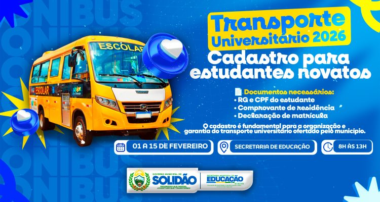 A Secretaria Municipal de Educação de Solidão iniciou o período de cadastro para o transporte universitário referente ao ano letivo de 2026. A ação é destinada aos estudantes universitários novatos que utilizarão o serviço de transporte intermunicipal ofertado pelo município.