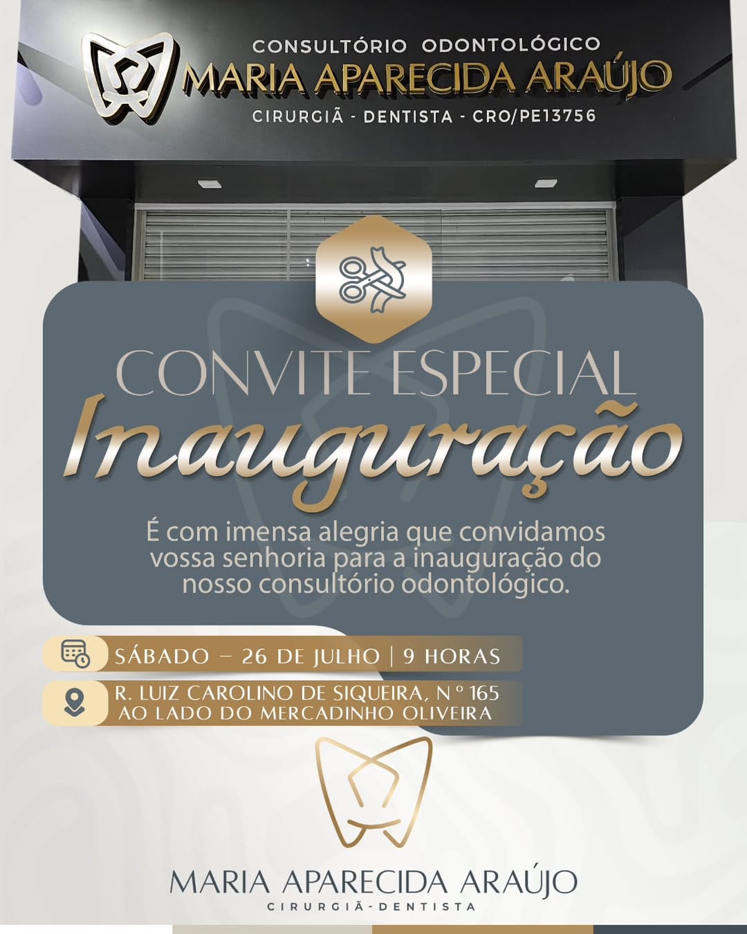 Solidão ganha novo espaço odontológico com a inauguração da clínica Maria Aparecida Araújo Consultório moderno e acolhedor abre as portas com a proposta de cuidar da saúde bucal da população com carinho e excelência Solidão, no Sertão de Pernambuco, se prepara para receber um novo espaço dedicado à saúde e ao bem-estar: o Consultório Odontológico Maria Aparecida Araújo será oficialmente inaugurado neste sábado, 26 de julho, às 9h da manhã, com cerimônia aberta ao público. Localizada na Rua Luiz Carolino de Siqueira, nº 165, ao lado do Mercadinho Oliveira, a clínica representa a realização de um sonho da cirurgiã-dentista Maria Aparecida Araújo, que compartilha esse momento com entusiasmo e gratidão. “Foram dias de planejamento, cuidado e muito trabalho para criar um espaço acolhedor, moderno e feito com carinho para cuidar de você e do seu sorriso”, afirma Maria Aparecida. Com estrutura moderna e atendimento humanizado, o novo consultório foi pensado para proporcionar conforto, segurança e excelência em saúde bucal, tornando-se uma nova referência para Solidão e região. A população está convidada a participar da inauguração e conhecer de perto esse novo espaço feito para cuidar de sorrisos.