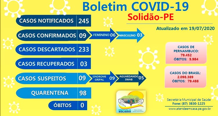 Conforme o boletim diário da Covid-19 divulgado nesta neste domingo (19 de julho de 2020), pela Secretária de saúde de Solidão por meio da Vigilância em Saúde, não houveram novos casos positivo da Covid-19 no município. O último teste positivo foi realizado dia 13 de julho, no momento Solidão tem 09 casos positivos.