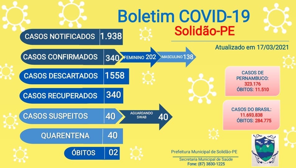O município de Solidão Pernambuco no Sertão do Pajeú totalizou nesta quarta-feira (17 de março de 2021), 1938 notificações, 340 casos confirmados da Covid-19, 202 femininos e 138 masculinos, 1558 descartados e 340 recuperados.