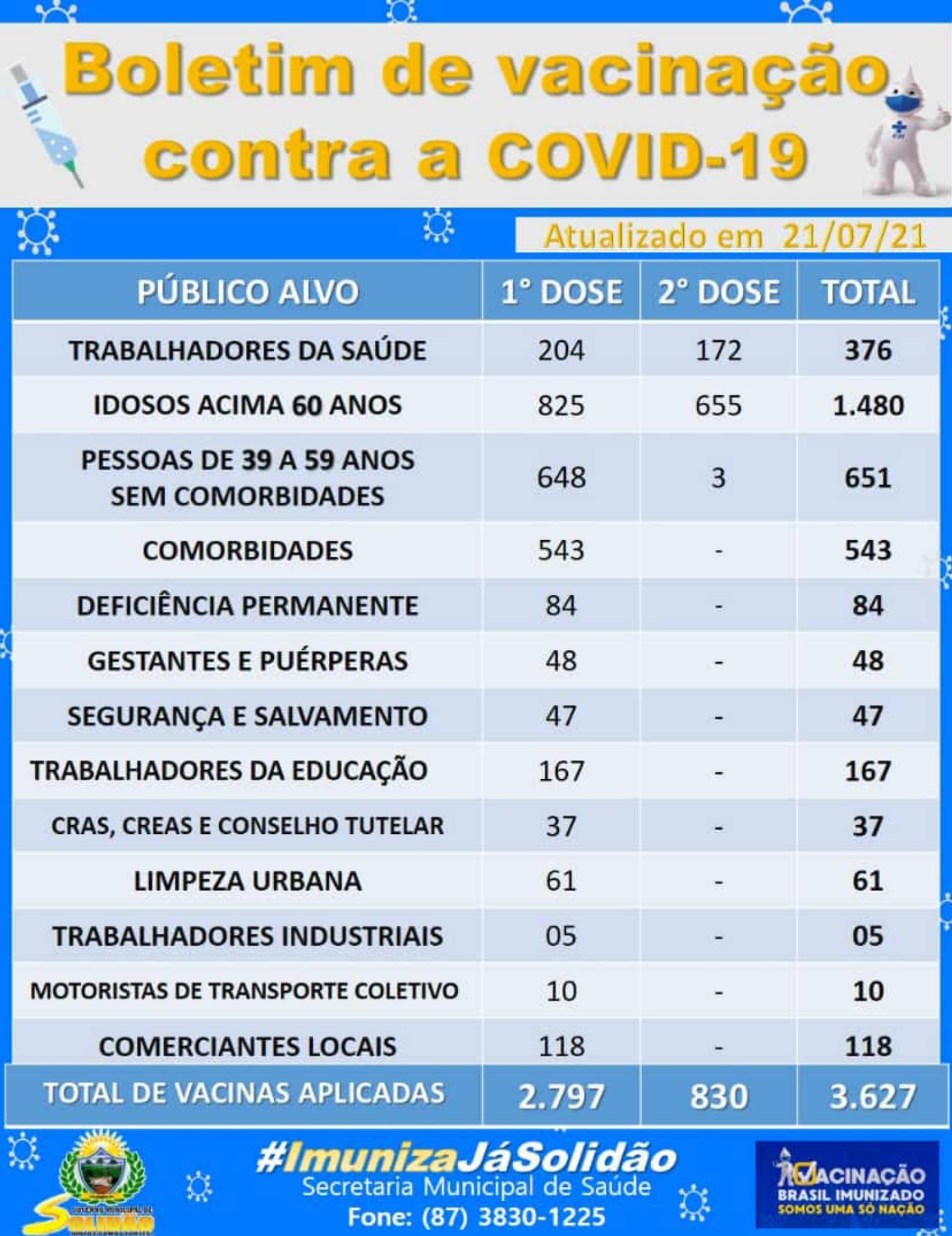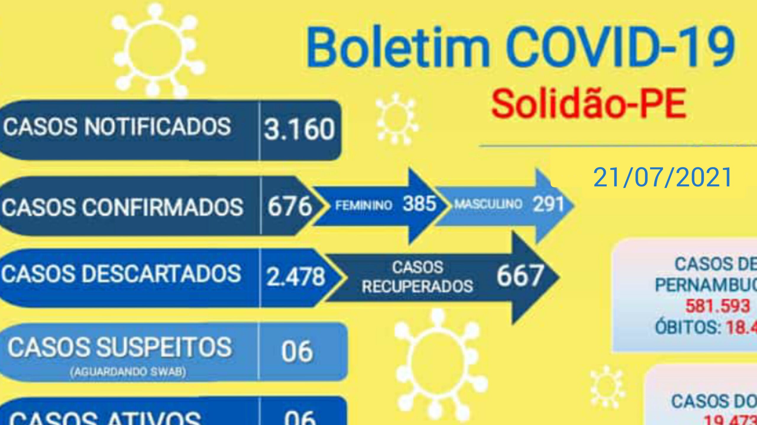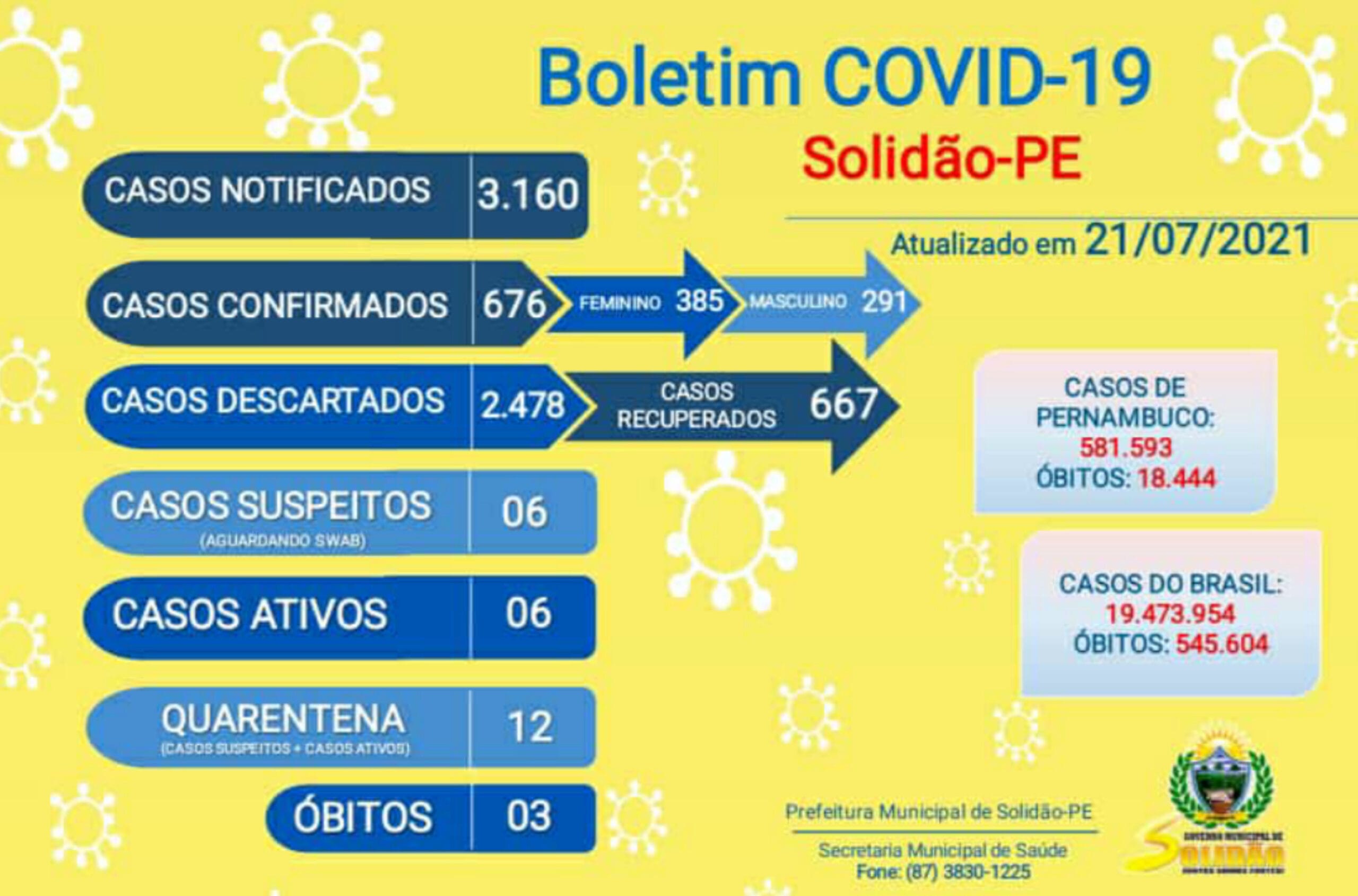 Solidão-PE: Boletim informativo Covid-19 – 21/07/2021 João Santos Covid-19 22 de julho de 2021 0 O município de Solidão, localizada no Sertão de Pernambuco, totalizou nesta quarta-feira (21 de julho de 2021), 3,160 casos notificados, 676 casos confirmados, sendo 385 femininos e 291 masculinos. Solidão tem 667 casos recuperados e 03 óbitos.