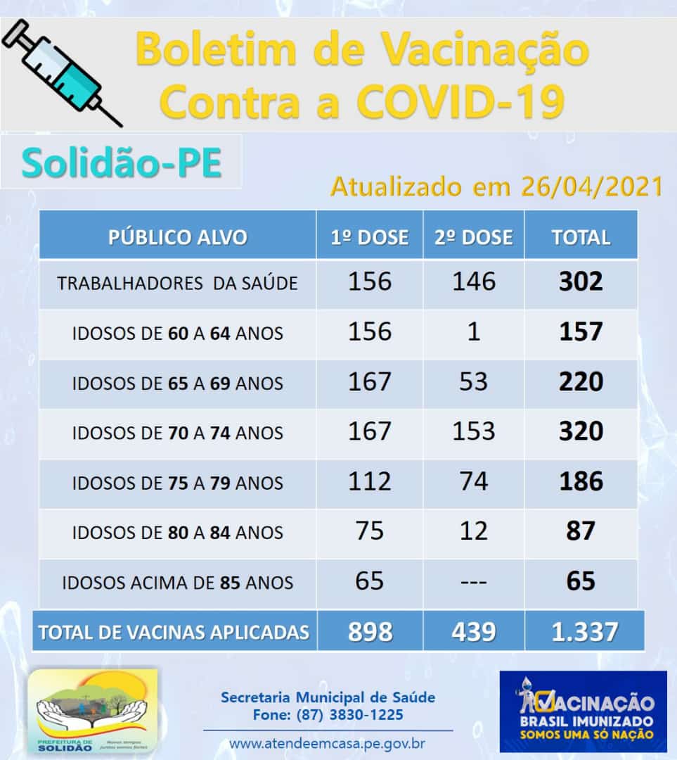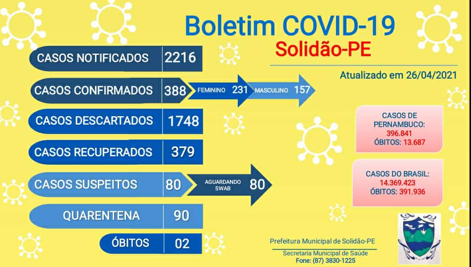 O município de Solidão, localizada no Sertão de Pernambuco, totalizou nesta segunda-feira (26 de abril de 2021), 2216 notificações, 388 casos confirmados da Covid-19, 231 femininos e 157 masculinos, 1.748 descartados, 379 recuperados, 90 em quarentena e 2 óbitos.
