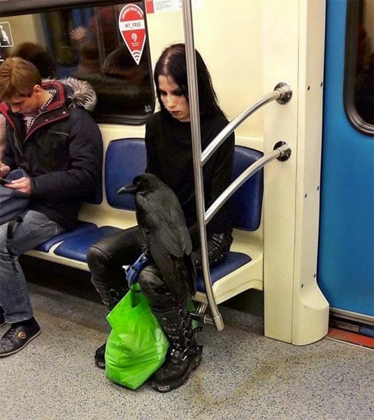 Essa é uma das fotos mais estranhas de todas, e até um pouco assustadora. Essa jovem, de estilo bastante gótico, simplesmente decidiu embarcar com o seu corvo de estimação.