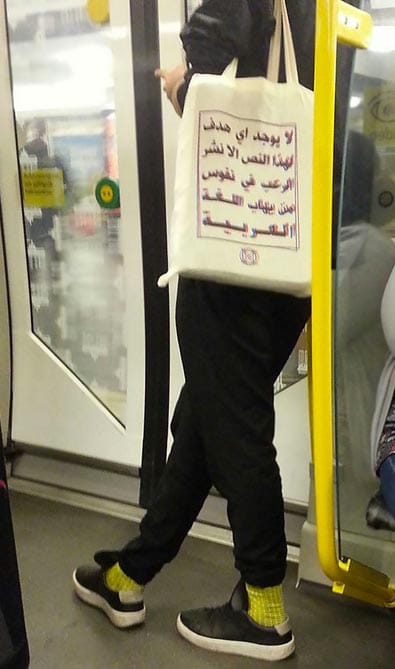 Um passageiro do metrô de Berlim, na Alemanha, embarcou com uma bolsa com dizeres em árabe. A mensagem dizia: “Este texto não possui outra finalidade senão a de aterrorizar aqueles que têm medo da língua árabe”.