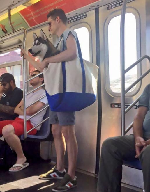 Os cães não são permitidos no metrô de Nova York, a menos que estejam em uma sacola. Essa foi a solução encontrada pelo rapaz para viajar com seu melhor amigo!