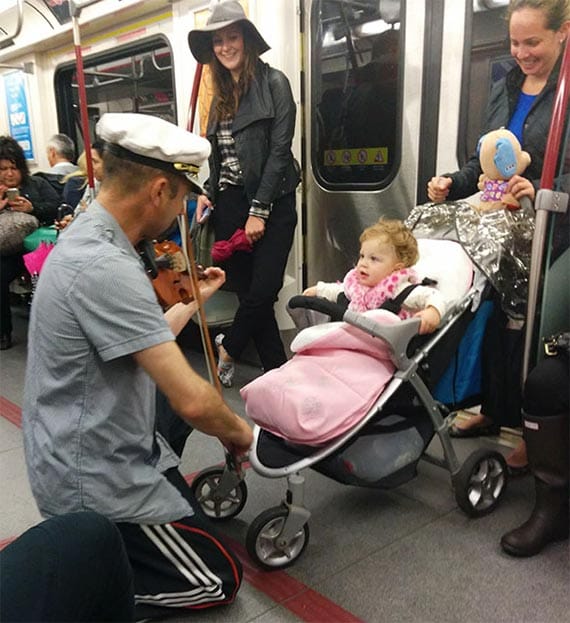 Um homem simplesmente se ajoelhou para tocar violino para um bebê que estava chorando no metrô. Parece que a música realmente acalmou a criança.