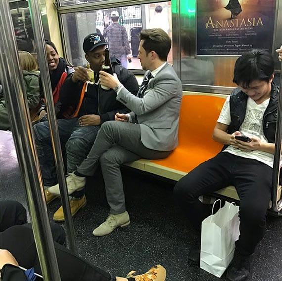 Nesta foto, dois completos estranhos simplesmente abrem uma garrafa de vinho, brindam e começam a beber no metrô de Nova York.